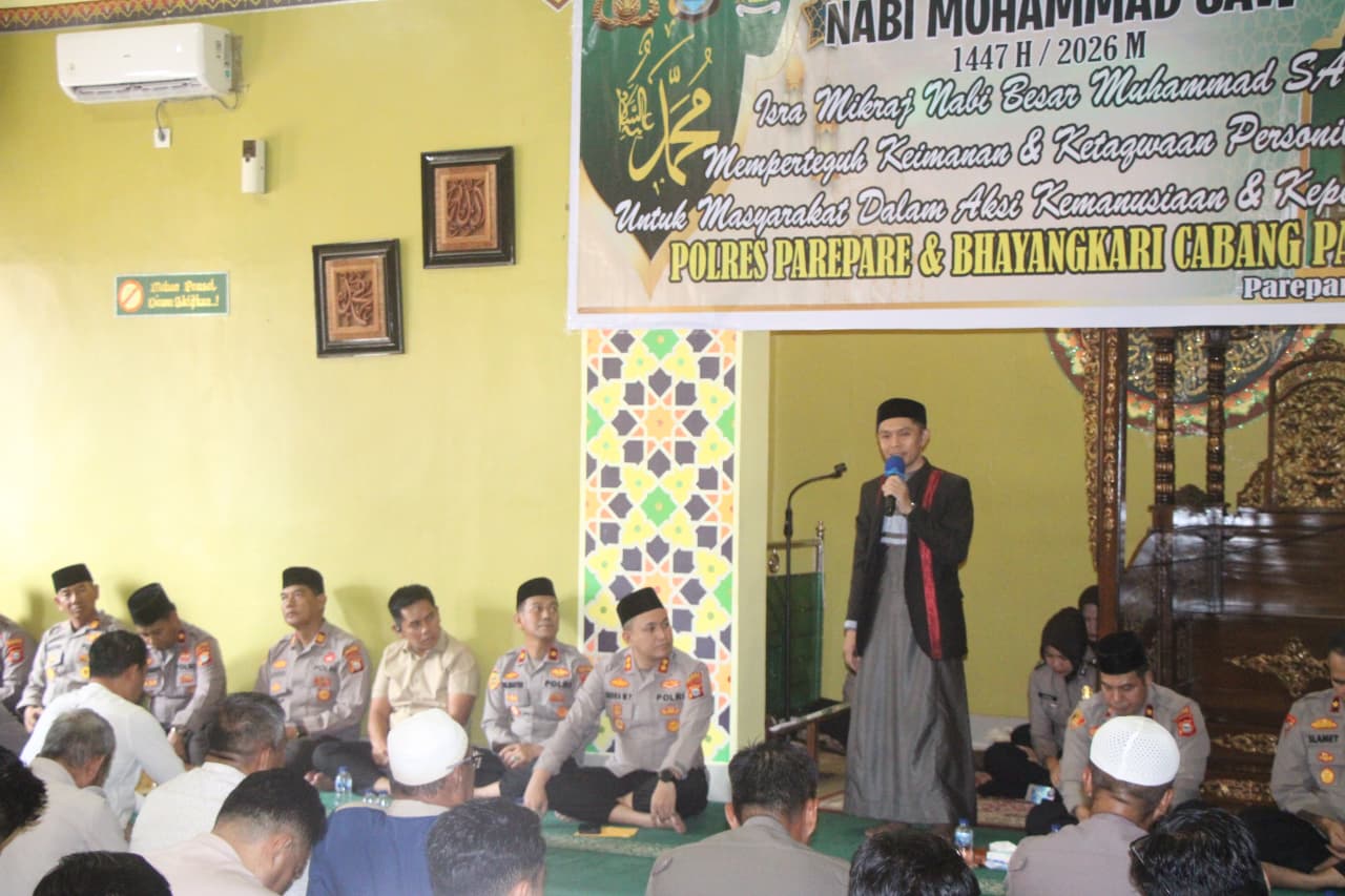 Spektroom - Polres Parepare menggelar peringatan Isra Mi’raj Nabi Besar Muhammad SAW 1447 Hijriah/2026 Masehi di Masjid Mujahid Baiturrahim, Jalan Muhammad Qurdi, Kelurahan Ujung Baru, Kecamatan Soreang, Kota Parepare, Selasa (27/1/2026).