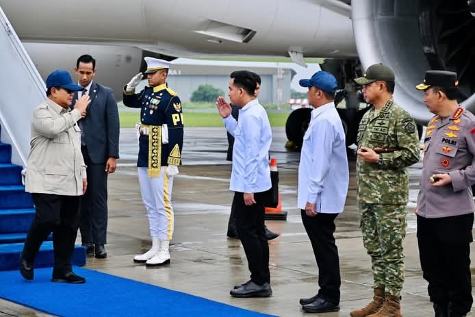 Di Pangkalan TNI AU Halim Perdanakusuma, Jakarta, Presiden Prabowo Subianto disambut Wakil Presiden Gibran Rakabuming, Panglima TNI Jenderal Agus Subiyanto, Kapolri Jenderal Polisi Listyo Sigit Prabowo dan sejumlah Menteri Kabinet Merah Putih.