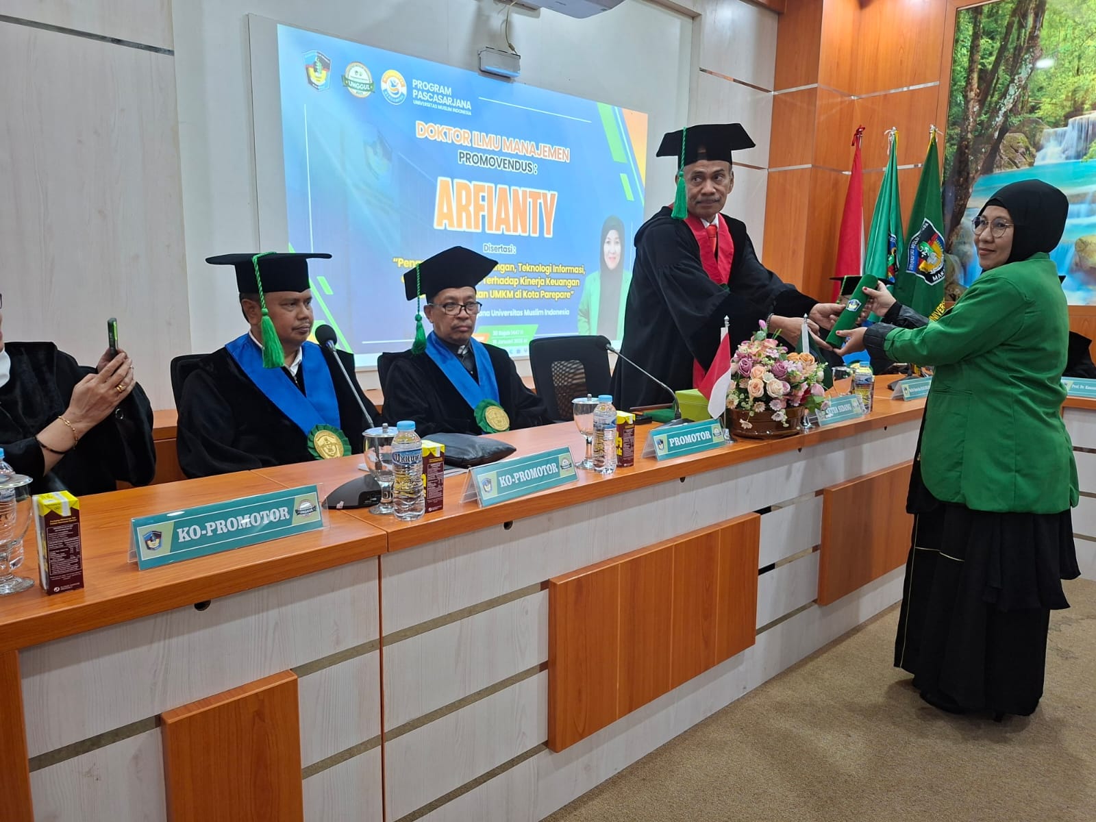 Sementara sebagai Promovenda, dibimbing Co Promotor 2 Dr. Asriani Junaid, SE., MSA., Ak., CA, Co Promotor 1 Prof. Dr. H. Muhammad Su'un, S.E., M.Si dan Promotor Prof. Dr. H. Mahfud Nurnajamuddin, S.E. M.Si.