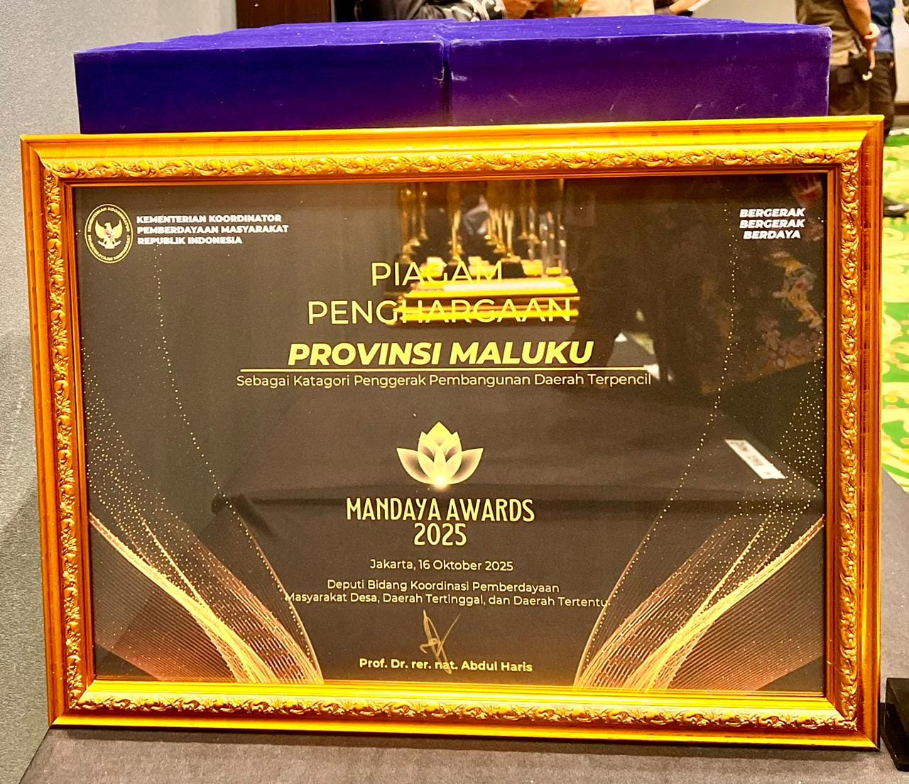 Spektroom - Provinsi Maluku meraih peringkat kedua dalam kategori Penggerak Daerah Terpencil pada ajang Mandaya Award 2025 yang diselenggarakan oleh Kementerian Koordinator Bidang Pemberdayaan Masyarakat Republik Indonesia, bertempat di Ballroom Lantai 6, Plaza Jamsostek, Kamis (16/10/2025)