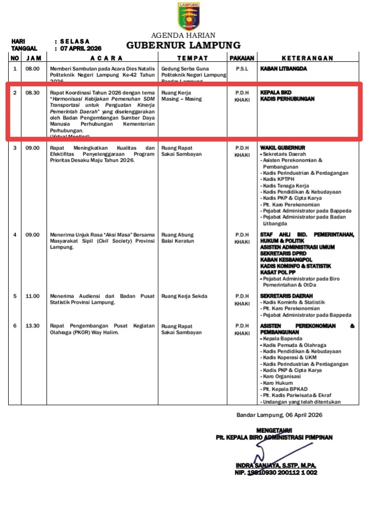 Bandarlampung - Spektroom: Kepala BKD Provinsi Lampung Rendi Reswandi dan Kepala Dinas Perhubungan Provinsi Lampung Bambang Sumbogo, pagi Ini Selasa (7/4/2026) Pukul 08.30 WIB dijadwalkan akan mengikuti Rapat Koordinasi (Rakor) Tahun 2026, dari ruang kerja masing-masing.