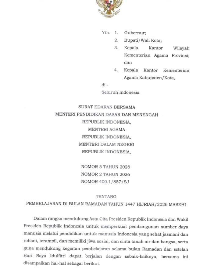 Spektroom - Pemerintah melalui Kementerian Agama Republik Indonesia bersama Kementerian Pendidikan Dasar dan Menengah serta Kementerian Dalam Negeri menerbitkan Surat Edaran Bersama (SEB) tentang Pembelajaran di Bulan Ramadan 1447 Hijriah/2026 Masehi. Aturan ini menjadi acuan nasional bagi daerah dan satuan pendidikan dalam mengatur ritme belajar selama Ramadan hingga usai Idulfitri.