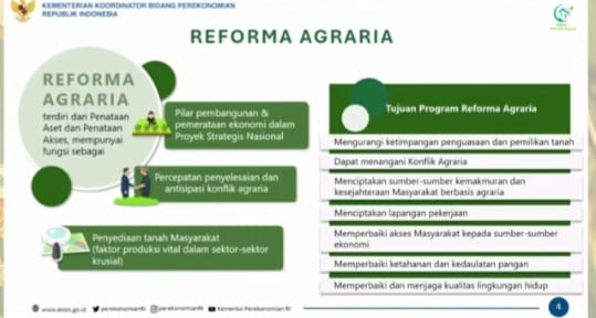"Targetnya adalah melaksanakan pemerataan ekonomi melalui penataan eset (lanan) berupa legalisasi dan redistribusi lahan" ujarnya menjelaskan (@Ng).