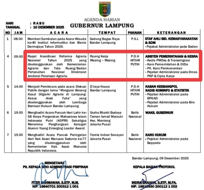 Spektroom - Asisten Bidang Pemerintahan & Kesra Setdaprov Lampung M. Firsada bersama Kepala Dinas PMDes & Transmigrasi, Kepala Biro (Karo) Pemerintahan & Otonomi Daerah dan Plt. Karo Perekonomian serta beberapa Pejabat Administrator pada Dinas PKP & Cipta Karya, mengikuti Rapat Koordinasi Reforma Agraria Nasional Tahun 2025, secara virtual dari ruang kerja Asisten Pemkesra, Rabu (10/12/2025).