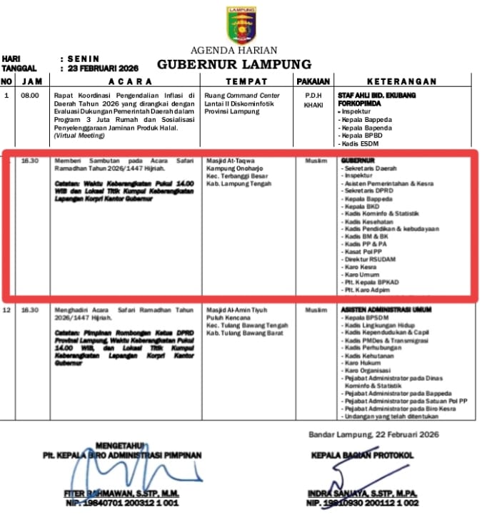 Spektroom - Agenda Safari Ramadhan Gubernur Lampung telah diterbitkan 3 Februari lalu, sebagaimana tertera dalam surat Edaran Sekdaprov (SE) Marindo Kurniawan nomor: 400.8.1/23/02/2026 dengan Hal: Pelaksanaan Kegiatan Safari Ramadhan Pemerintah Provinsi Lampung.