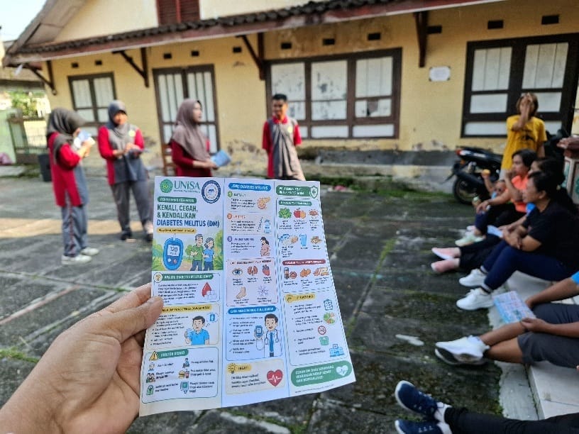 Pada kesempatan itu, tim mahasiswa Unisa menyampaikan edukasi “Kenali, Cegah dan Kendalikan Diabetes Melitus (DM). Beberapa poin penting dari edukasi atau penyuluhan itu, mencakup pentingan pemahaman tentang DM, faktor resiko, gejala, pengendalian dan pencegahan serta penerapan pola hidup sehat.