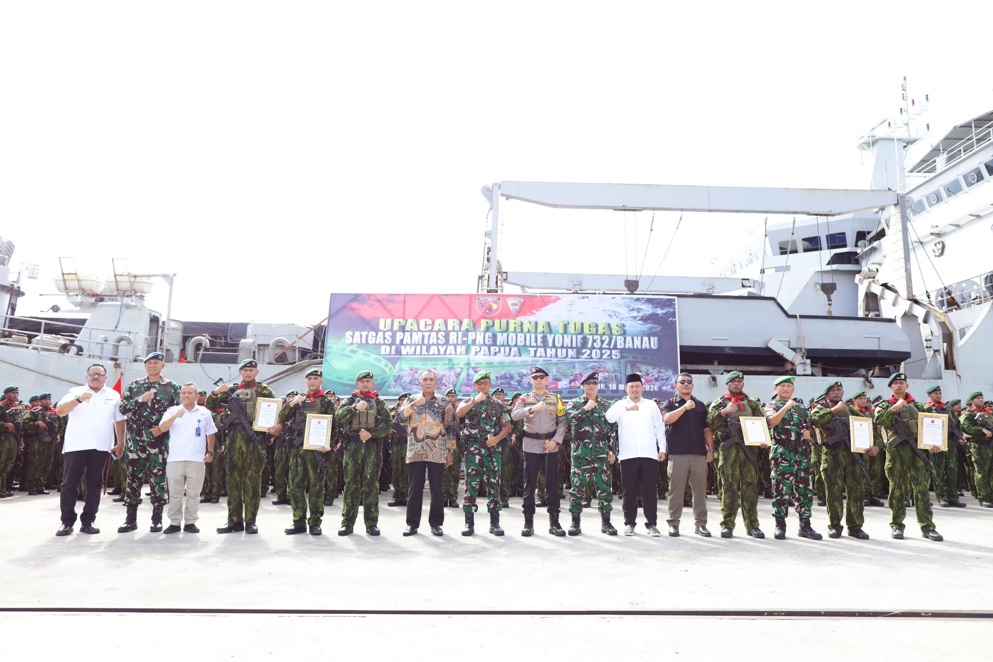 Ambon - Spektroom: Kapolda Maluku Irjen Pol. Prof. Dr. Dadang Hartanto menghadiri upacara penyambutan purna tugas Satgas Pengamanan Perbatasan (Pamtas) RI–PNG Mobile Yonif 732/Banau di Dermaga Guspurla Koarmada III, Ambon, Rabu (18/3/2026).
