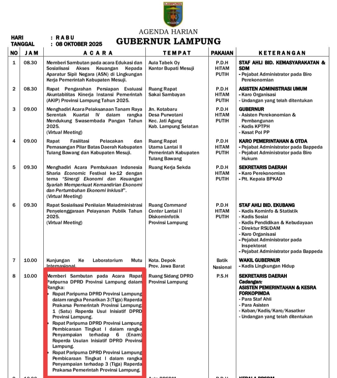 Spektroom - Mewakili Gubernur Lampung, Sekretaris Daerah Provinsi (Sekdaprov) Lampung Marindo Kurniawan dijadwalkan menghadiri dan menyampaikan sambutan pada Rapat Paripurna DPRD Provinsi Lampung dalam Rangka Penarikan 3 Raperda Prakarsa Pemerintah Provinsi Lampung dan 1 Raperda Usul Inisiatif DPRD Provinsi Lampung, di Ruang Rapat Paripurna DPRD Lampung, Pukul 10.00 WIB Rabu (8/10/2025).
