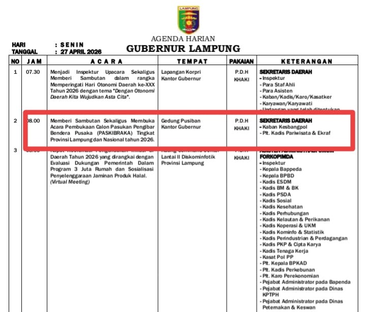 Bandarlampung - Spektroom: Seleksi Calon Anggota Pasukan Pengibar Bendera Pusaka (Paskibraka) Tingkat Provinsi Lampung dan Tingkat Nasional Tahun 2026 dimulai, kegiatan tersebut dibuka Sekretaris Daerah Provinsi (Sekdaprov) Lampung di Gedung Pusiban, kompleks kantor gubernur Lampung, Senin (27/4/2026).