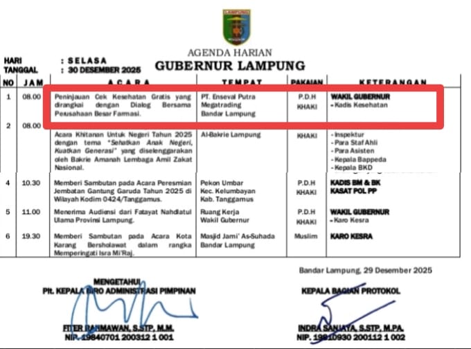 Hal itu disampaikan Wakil Gubernur Lampung, Jihan Nurlela, saat meninjau kegiatan Cek Kesehatan Gratis (CKG) Komunitas bersama Pedagang Besar Farmasi (PBF) Provinsi Lampung yang dipusatkan di PT Enseval Putra Megatrading Bandarlampung, Selasa (30/12/2025).