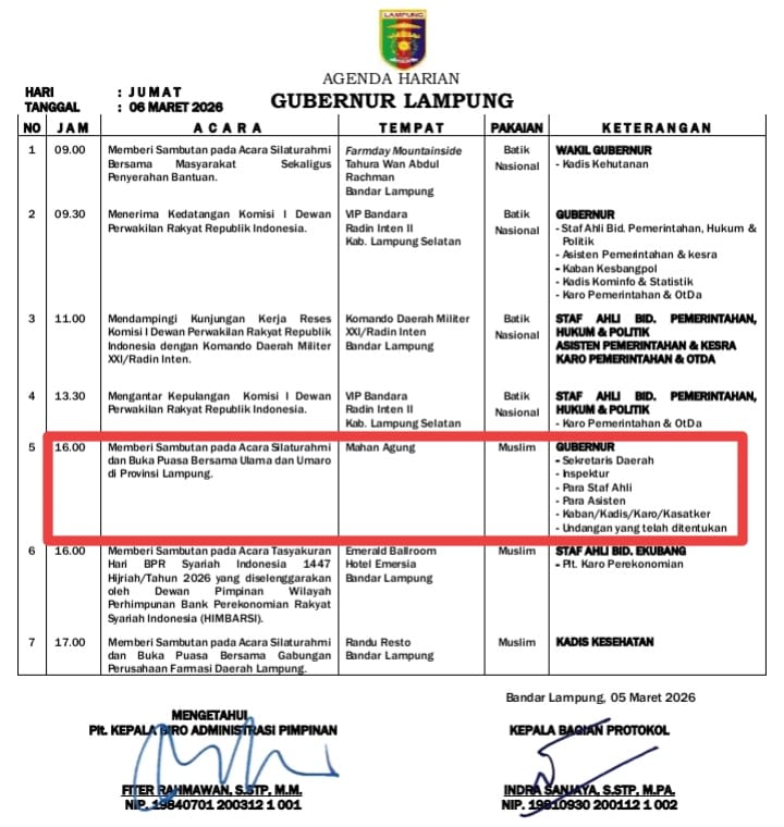 Bandarlampung - Spektroom: Gubernur Lampung Rahmat Mirzani Djauzal, sore nanti, Jum'at 6 Maret 2026 pukul 16.00 WIB dijadwalkan akan menggelar Silaturahmi dan Buka Puasa Bersama Ulama dan Umaro di Provinsi Lampung.