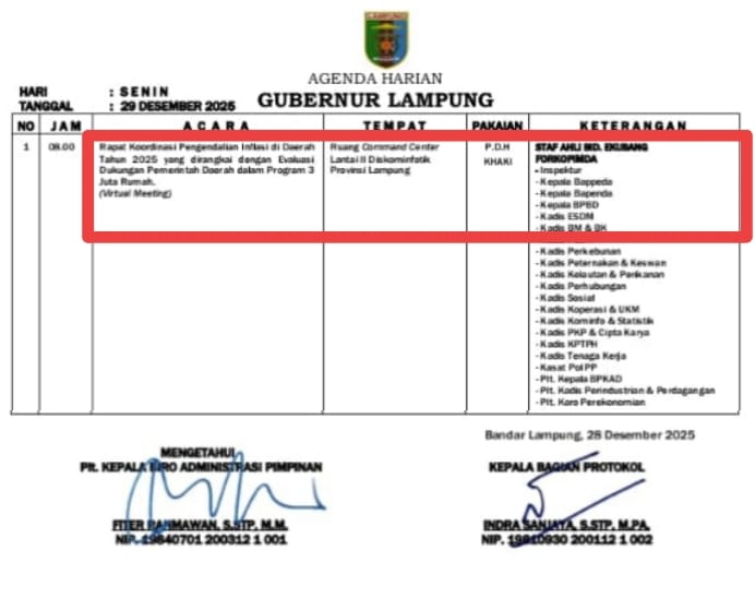 Spektroom - Tim Pengendalian Inivlasi Daerah (TPID) Provinsi Lampung dipimpin Staf Ahli Gubernur Bidang Ekubang Bani Ispriyanto, bersama Anggota Forkopimda serta beberapa kepala OPD terkait, mengikuti Rapat Koordinasi Pengendalian Inflasi di Daerah Tahun 2025, secara Virtual Meeting dari ruang Command Centre (Pusat Kendali Data) Diskominfotik Provinsi Lampung, Senin (29/12/2025).