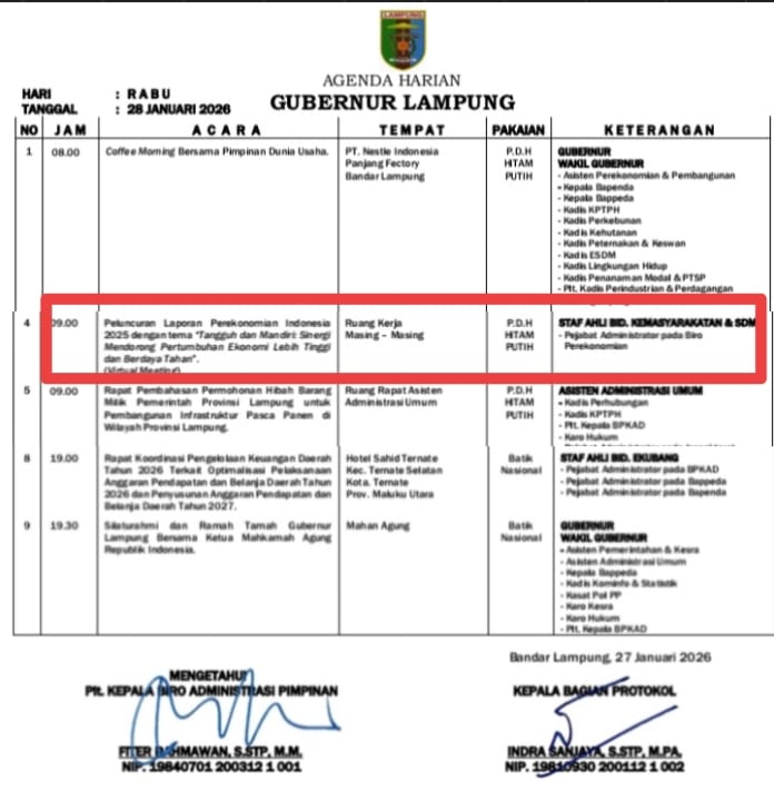 Spektroom - Mewakili Gubernur Lampung Staf Ahli Gubernur Bidang Kemasyarakatan & SDM Lukman Pura dan Pejabat Administrator pada Biro Perekonomian Sekretariat Daerah Provinsi (Setdaprov) Lampung, hari ini Rabu (28/1/2026) pukul 09.00 WIB dijadwalkan mengikuti Peluncuran Laporan Perekonomian Indonesia 2025 dengan tema “Tangguh dan Mandiri: Sinergi Mendorong Pertumbuhan Ekonomi Lebih Tinggi dan Berdaya Tahan”, secara Virtual Meeting dari ruang kerja masing-masing.