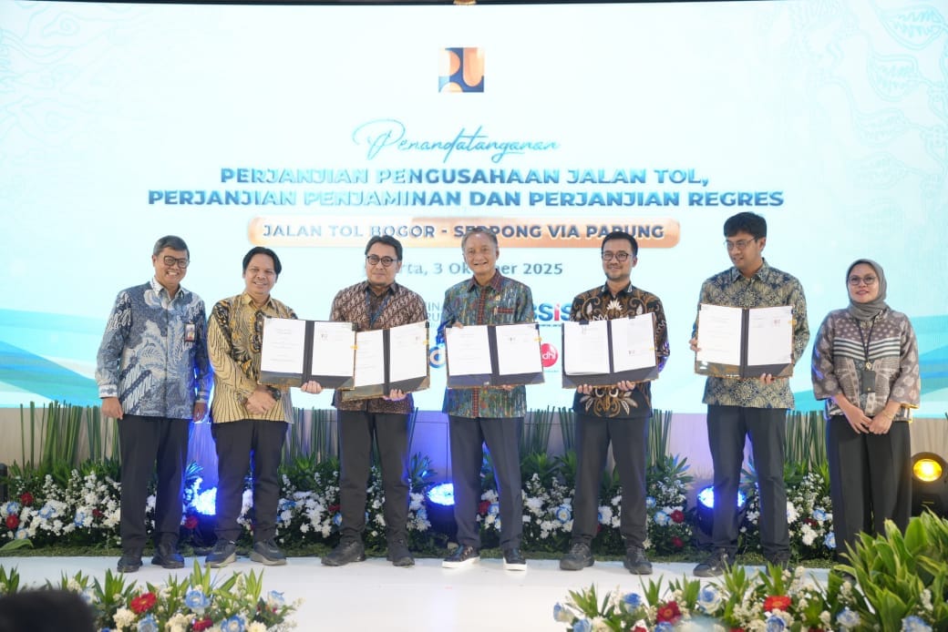 Spektroom - PT Bogor Serpong Infra Selaras (BSIS) selaku Badan Usaha Jalan Tol (BUJT) yang dibentuk oleh Konsorsium Swasta-Badan Usaha Milik Negara (BUMN) beranggotakan PT Persada Utama Infra (PUI), PT Jasa Marga (Persero) Tbk (JSMR), PT Adhi Karya (Persero) Tbk (ADHI), dan PT Hutama Karya Infrastruktur (HKI) menandatangani Perjanjian Pengusahaan Jalan Tol (PPJT) dan Perjanjian Penjaminan Jalan Tol Ruas Bogor – Serpong (via Parung). Selain itu, Perjanjian Regres juga turut ditandatangani di Pendopo Kementerian Pekerjaan Umum (PU) Jakarta pada Jumat (03/10/2025)
