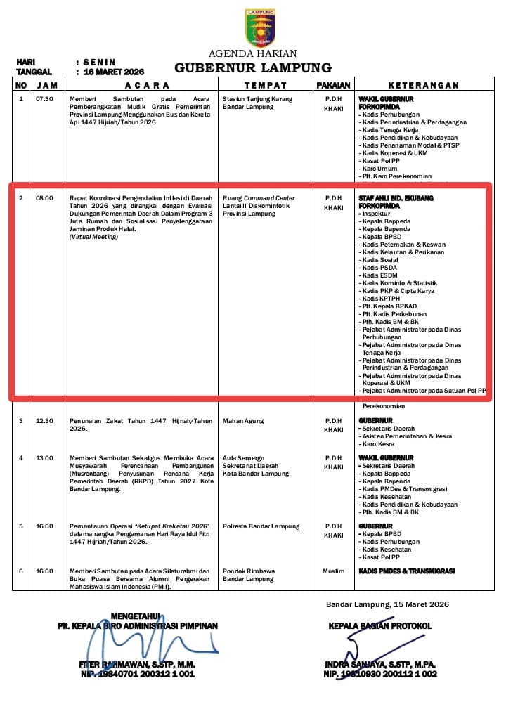 Bandarlampung - Spektroom: Tim Pengendalian Inflasi Daerah (TPID) Provinsi Lampung dipimpin Staf Ahli Gubernur Bidang Ekubang Bani Ispriyanto bersama anggota Forkopimda dan Inspektur Inspektorat Provinsi Lampung Bhayana serta Kepala dinas dan Badan dilingkungan Pemprov Lampung, Senin (16/3/2026) mengikuti Rapat Koordinasi Pengendalian Inflasi di Daerah Tahun 2026 secara Virtual Meeting, bertempat di Ruang Command Center Lantai II Diskominfotik Provinsi Lampung, di Bandarlampung.