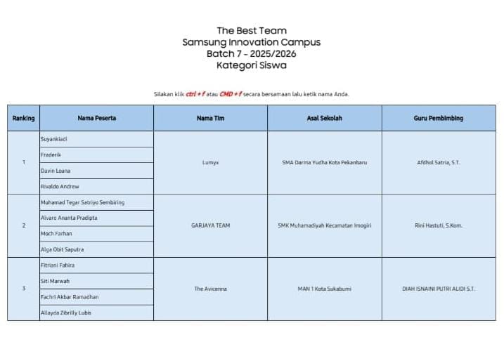 Spektroom – Prestasi nasional kembali ditorehkan siswa MAN 1 Kota Sukabumi. Tim “The Avicenna” sukses meraih The Best Team Juara 3 Nasional dalam ajang Samsung Innovation Campus Batch 7 Tahun 2025/2026 kategori SMA/SMK/MA. Pengumuman resmi disampaikan Rabu (18/02/2026).
