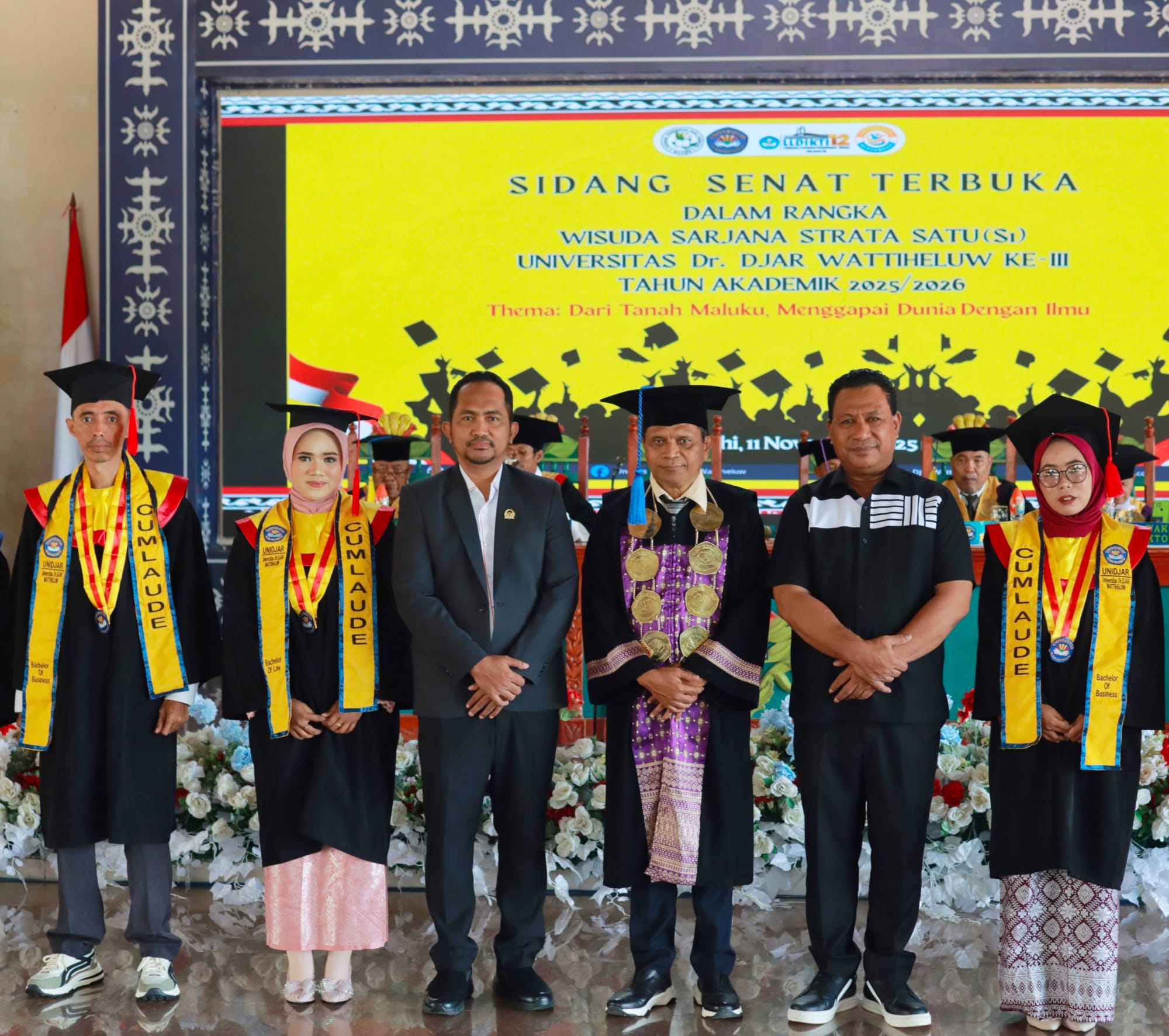 Spektroom,- Sebanyak 158 Wisudawan Universitas Dr. Djar Wattiheuw mendapat gelar Strata Satu pada acara Sidang Senat terbuka dalam rangka Wisuda Sarjana Strata Satu Tahun akademik 2025-2026 bertempat di Baileo Ir. Soekarno Kota Masohi Kabupaten Maluku Tengah, ( Selasa, 11/11/2025).