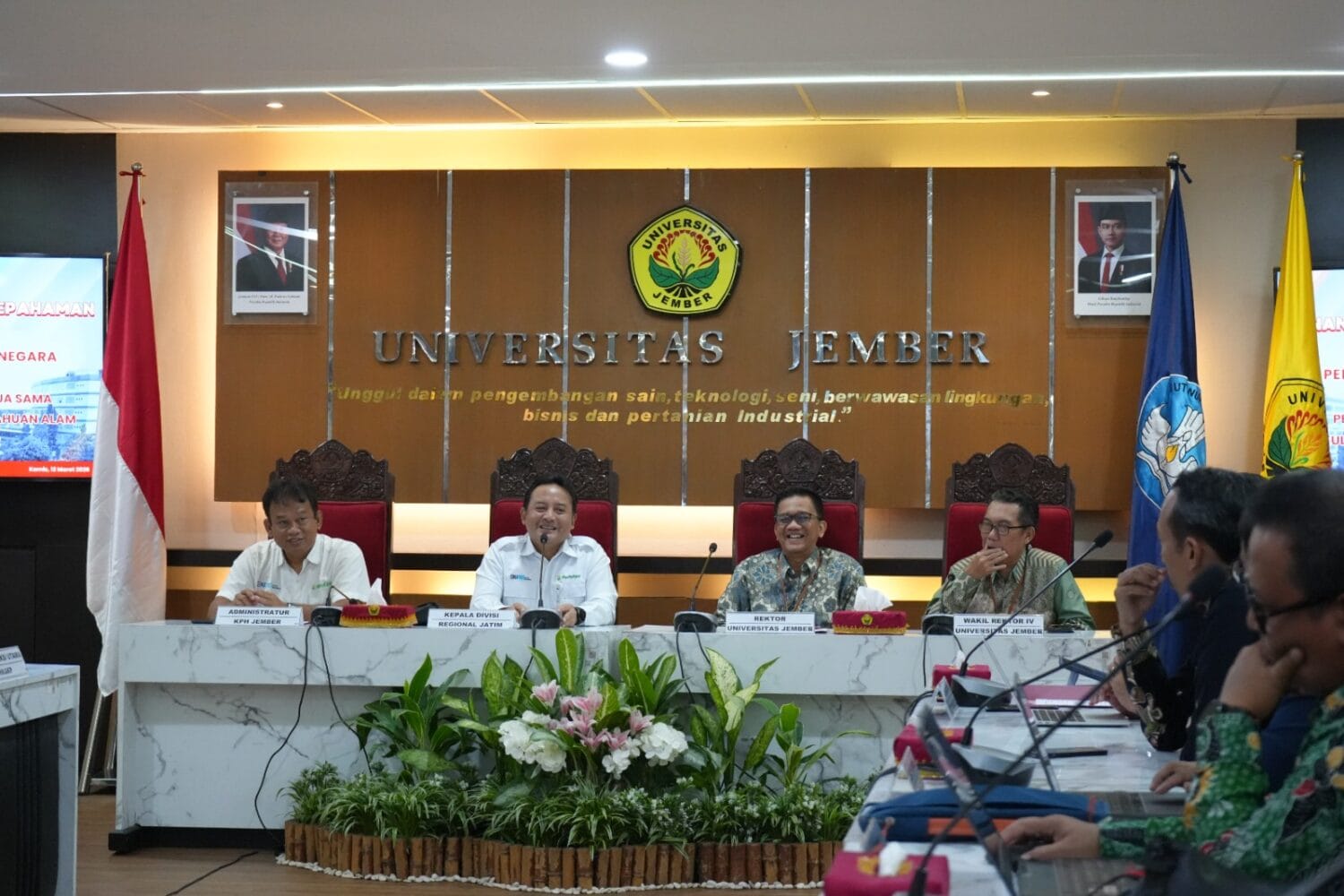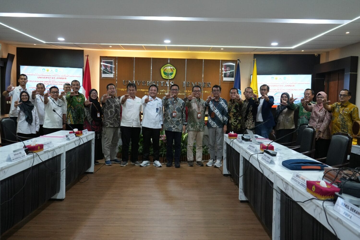 Momentum penting ini turut disaksikan oleh Dekan Fakultas Pertanian (FAPERTA), Dekan Fakultas Ekonomi dan Bisnis (FEB), Dekan Fakultas Teknologi Pertanian (FTP), serta Wakil Dekan FMIPA, yang menandakan kesiapan UNEJ untuk berkolaborasi secara multidisiplin dalam menjaga kelestarian hutan dan kesejahteraan masyarakat. (Yul/dil)