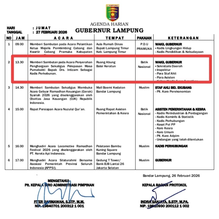 Sementara itu, Kepala Badan Kepegawaian Daerah (BKD) Provinsi Lampung Rendi Reswandi melaporkan, pada periode Maret 2026 terdapat 42 PNS yang memasuki masa purna bakti. Rinciannya, 8 orang dari Golongan III dan 34 orang dari Golongan IV.