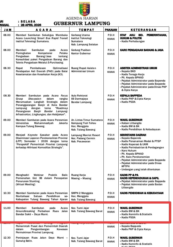 Tubaba - Spektroom : Didampingi Bupati Tulang Bawang Barat (Tubaba), Ir. Novriwan Jaya, S.P., Wakil Gubernur Lampung Jihan Nurlela meninjau Groundbreaking Perbaikan Ruas Jalan Bandar Sakti – Daya Murni Kec. Tumi Jajar Kab. Tulang Bawang Barat, Selasa (28/04/2026).