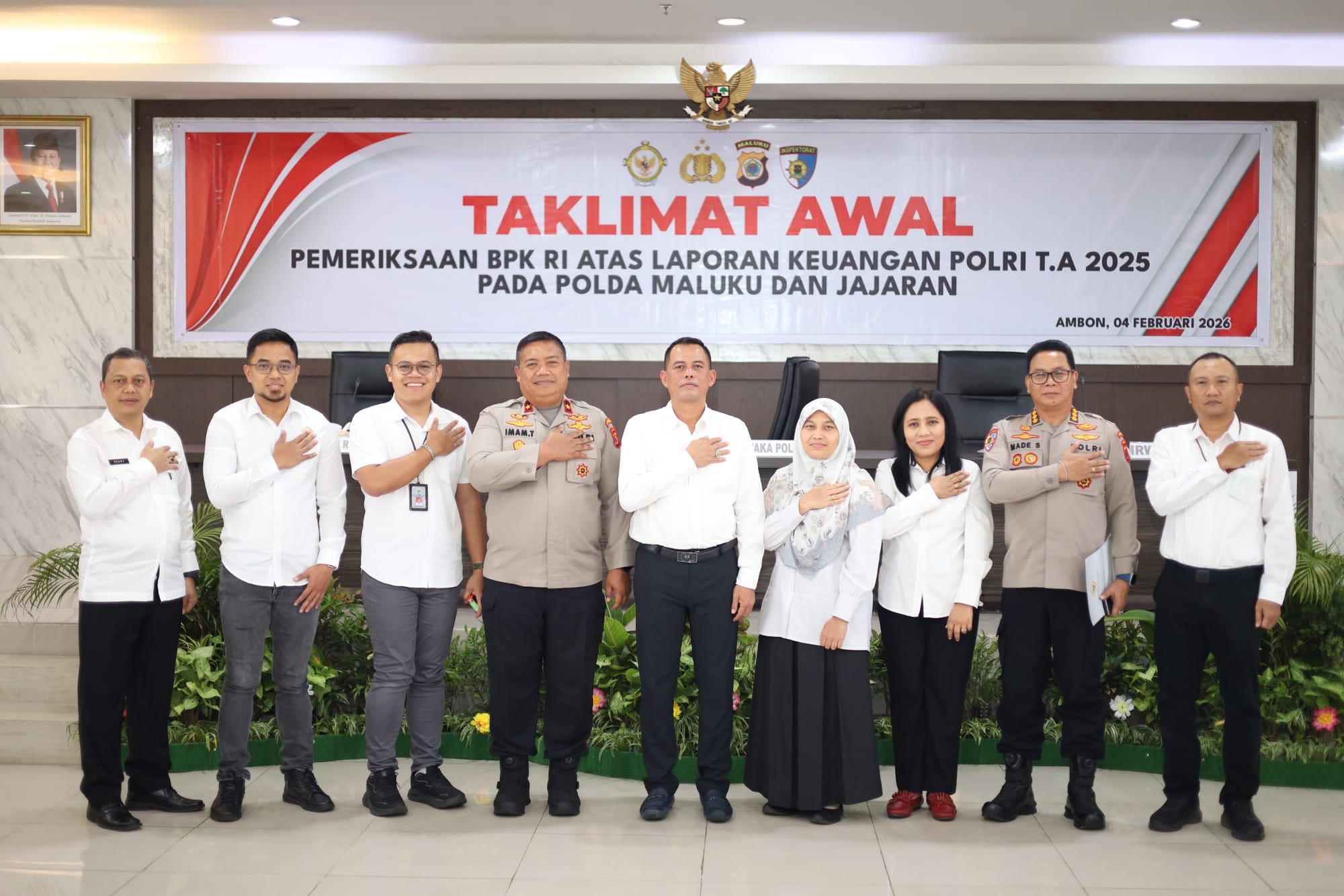 "Kehadiran tim BPK RI merupakan suatu kehormatan sekaligus kesempatan bagi kita untuk menerima koreksi maupun sumbangan pemikiran demi kemajuan Polda Maluku. Saya instruksikan para Kasatker, Kasubsatker, dan Kasatwil selaku objek pemeriksaan (Obrik) agar kooperatif dan memanfaatkan momen ini sebagai sarana konsultasi peningkatan kinerja," tegas Wakapolda mengutip amanat Kapolda Maluku.