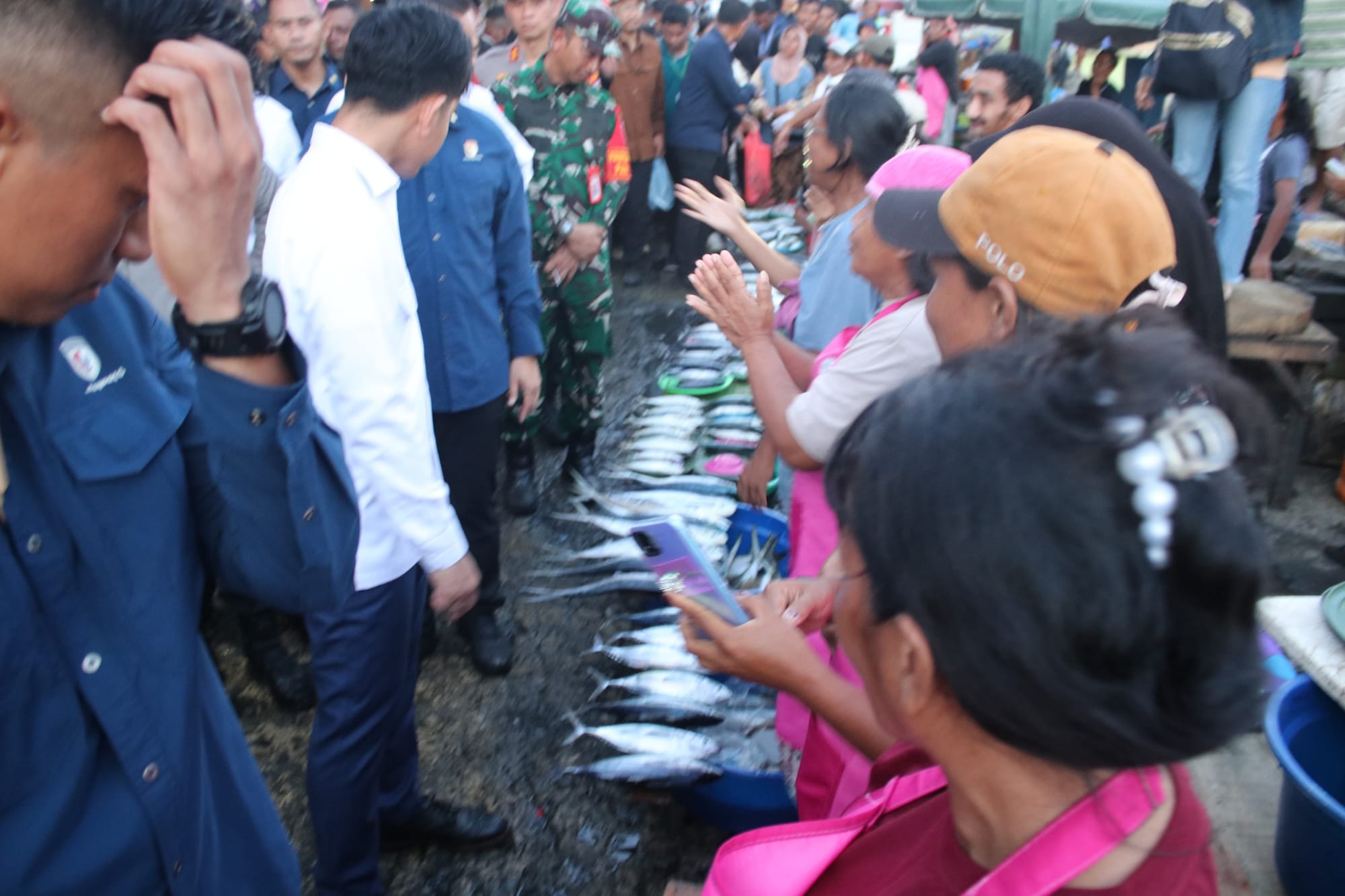 Dari gedung putih, Wapres bersama Gubernur berjalan menuju kawasan Arumbae, pusat penjualan hasil laut, sambil tetap disapa hangat warga yang memadati jalur keluar pasar.
